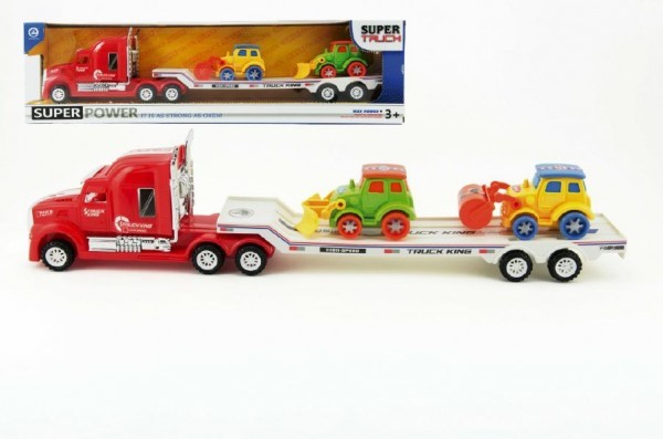 Auto kamion s návěsem na setrvačník + 2 auta stavební plast 56cm v krabici