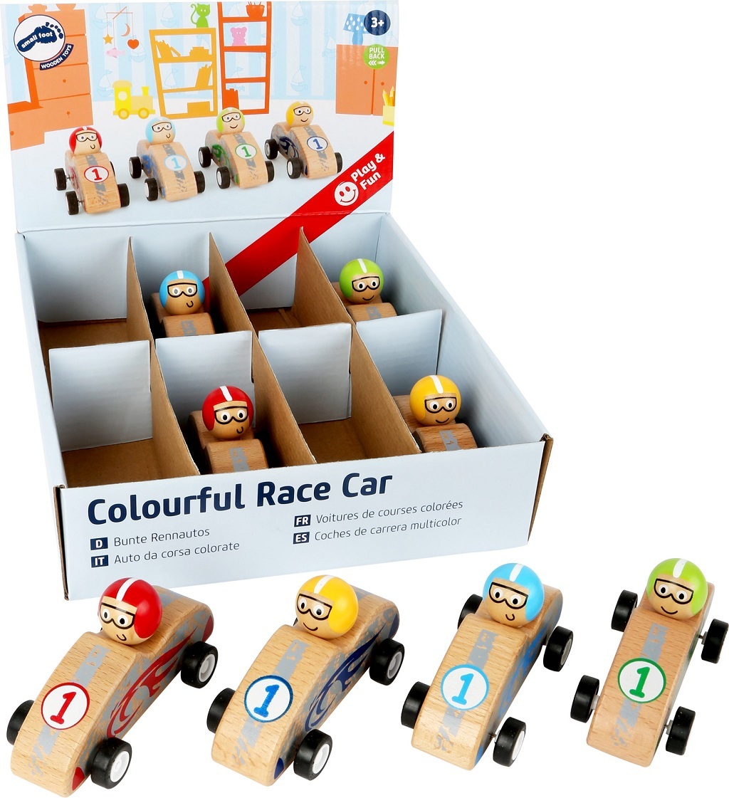 Small Foot Displej závodní auto na setrvačník 8 ks Tato barevná závodní auta vyrobená z glazurovaného dřeva a jejich roztomilí řidiči nejenže vypadají skvěle, ale také zajišťují spoustu zábavy. Setrvačník zajistí dostatečnou rychlost na závodišti. Nadchne lidi všech věkových skupin. Německá firma Legler zaměřená na výrobu kvalitních dřevěných hraček od roku 1996. Všechny dřevěné hračky značky Small Foot mají označení CE a jsou vyráběny dle evropské normy pro bezpečnost hraček EN 71. Použité barvy jsou speciálně vyvinuty pro dřevěné hračky a jsou odolné i proti slinám dětí. Dřevo, které se používá pro tyto hračky většinou pochází z lesnických společností zapojených do zalesňování. To nabízí všem zákazníkům možnost přispět k zachování přirozeně rostoucích lesů. Dřevěné hračky small foot jsou zářivě barevné produkty, které jsou vyrobeny převážně z přírodních surovin - dřeva. Dětem dělají radost od útlého věku, rozvíjí jejich hmatové a smyslové dovednosti. Cílem značky small foot je podporovat duševní a fyzický vývoj dětí.