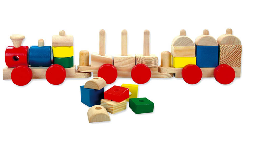 Barevný, dřevěný vláček - mašinka a dva vagónky, vše plné barevných dřevěných kostiček, které lze použít jako samostatnou stavebnici nebo je navlékat na tyčky.