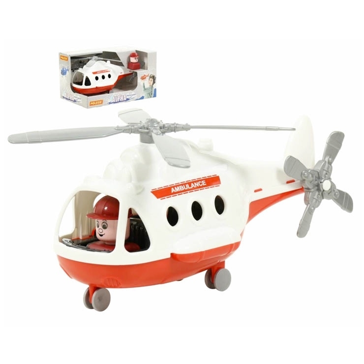 Wader vrtulník Alfa sanitní je 29 cm dlouhý bez pohonu, s volným pohybem vrtulí. Vyroben je z pevného plastu. Hračka je certifikována pro děti od 3 let věku, vyrobená od renomované značky Wader quality toys.