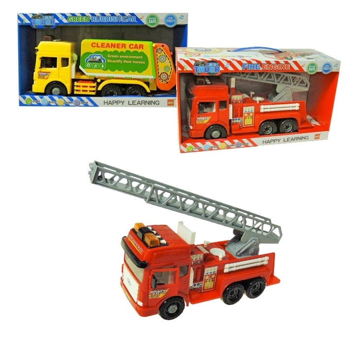 Ideální dárek pro malého dobrovolných hasičů nebo ochránce životního prostředí. Auto po zapnutí bliká a vydává zvuky charakteristické vozidlu. Na vrchu kabinky jsou tlačítka, po jejichž stisknutí auto buď troubí, startuje .... hasičský autu se mechanicky vytahuje žebřík a otevírají se dveře na kabině. Popeláři se zvedá kontejner, otevírají se dveře na kabině a kroucením páčky na boku otáčivým pohybem, otevírá recyklační nádobu. Hračka vyžaduje 2ks 1,5V baterií typu AA, které nejsou součástí balení. Možnost výběru ze dvou druhů a to požární nebo smetiarenske auto.