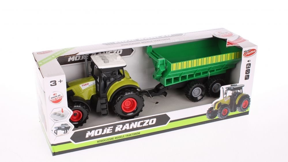Vozidlo má zvukové efekty, má odpojitelný přívěs nebo zemědělský stroj nebo tanker, přívěs a obraceč sena mají také pohyblivé části. Zemědělský stroj má světelné a zvukové efekty: zvuk bzučení motoru, farmáře oznamujícího jeho práci je konec, zvuk blížící se bouře a hlas farmáře oznamující, že jde do práce. Obsah sady: Traktor s přívěsem. Sada vyžaduje 3 x baterie AG13 - jsou součástí sady. Hračka vyrobená z plastu. Výrobek je určen pro děti ve věku 3+. Traktor s přívěsem. Rozměry balení [cm]: 35x13x11. Rozměry produktu traktoru (D x V x H) [cm] 15x10x9. Hračka je zabalená v krabici s okénkem.