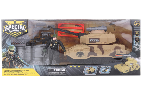 Vojenská sada s tankem obsahuje tank o velikosti cca 24 x 9 cm, barely, vojáka a další doplňky. Z tanku lze vystřelovat náboje. Rozměry balení cca 40,5 x 16,5 x 10,5 cm. Věk 3+ číst celé