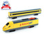 - Žlutý model vlaku RegioJet s kolejnicemi