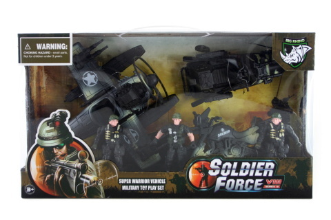 Vojenská sada obsahuje letadlo, člun, motorku a 3 vojáky. Rozměr letadla cca 19 x 19 cm. Rozměry balení cca 43 x 24,5 x 12 cm. Materiál plast. Věk 3+
