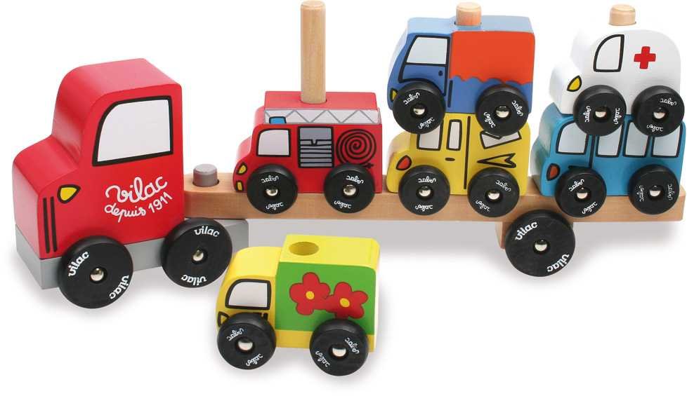 Dřevěná hračka která je nejen přívěsem s auty, ale také nasazovačkou, která trénuje motoriku a zručnost dětí. Děti mohou autíčka libovolně sundat, pohrát si s nimi a pak je opět nasadit na přívěs, s kterým odjedou na jiné místo. Obsahuje šest aut s různými motivy, například sanitku a hasiče. Hračky Vilac mají značku francouzské agentury ADEME, to znamená, že tyto dřevěné hračky jsou vyráběny ekologicky. Šetří životní prostředí, neznečišťují půdu, vodu a vzduch, neplýtvají energiemi. Již více než 100 let plní značka Vilac dětské sny. Společnost Vilac sídlí hluboko v srdci pohoří Jura, obklopena horami, jezery a lesy. Tato francouzská společnost vyrábí od roku 1911 dřevěné hračky v klasickém, starodávném stylu s moderními barvami a vzory. Hračky Vilac jsou jedinečné, nikdy nevyjdou z módy a dokáží okouzlit všechny generace. Vilac pomáhá utvářet dětskou představivost svými radostnými ilustracemi či dizajny a reinterpretací klasických hraček, které se jen tak neopotřebují. Děti dostávají na Vánoce a narozeniny spousty hraček, většina z nich je však nezaujme na dlouhou dobu, láska k hračce se nenaplní. Dřevěné hračky Vilac vzbuzují vášeň i o 50 let později, když jako dospělí náhodou najdete v podkroví hračky, které jste jako děti milovali. Vilac již 100 let propojuje děti s hračkami, které si oblíbí a váží si jich. A proč je děti tak milují? To zůstává tajemstvím firmy Vilac.