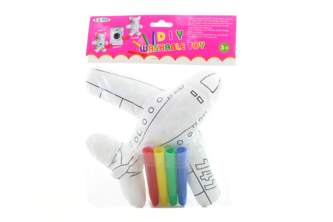 Vybarvovací letadlo s fixy. Letadlo lze vybarvit, poté vyprat a znovu vybarvit. Rozměr letadla cca 20 x 22 cm. Materiál polyester. Věk 3+