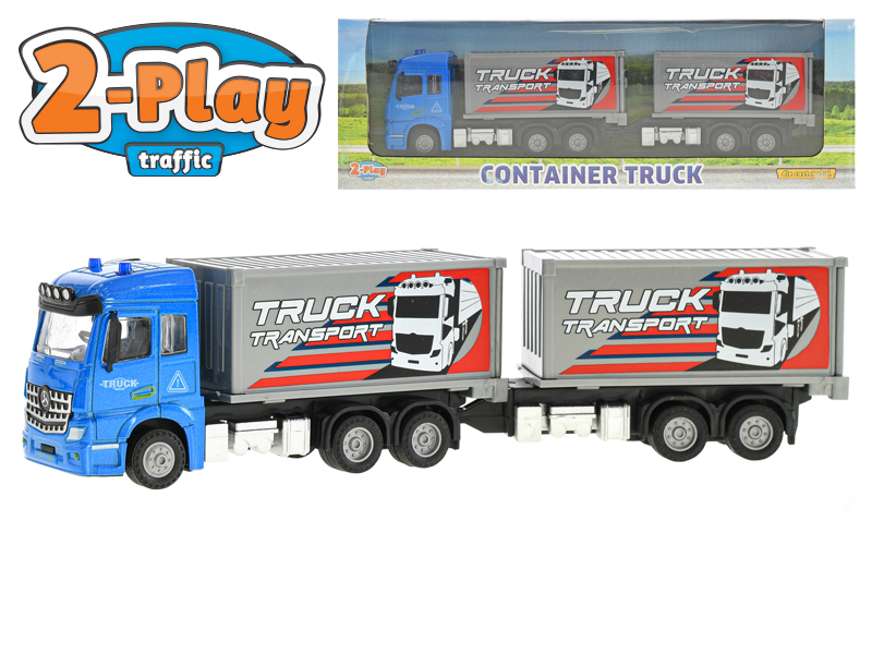 Přepravní auto o velikosti 29cm s přívěsem okouzlí každého malého chlapce. Auto má modrou barvu a na přívěsu má naloženy 2 kontejnery. Tento kovový set je součástí kolekce 2-Play.