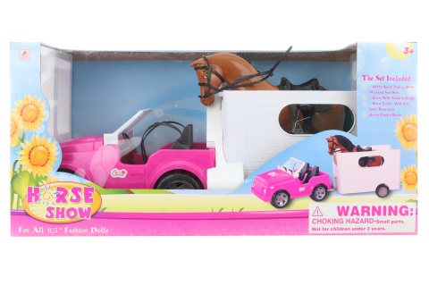Velké plastové auto pro panenky s přívěsem a koněm. Rozměry auta cca 28 x 18 x 18 cm, rozměr celé soupravy cca 55 x 21 x 18 cm. Rozměry balení cca 62,5 x 30 x 21 cm. Věk 3+