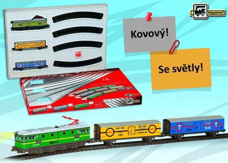 Kovový historický nákladní vlak na baterie se světlem a 2 vagóny, který jezdí po trati dlouhé 2,94 m. číst celé