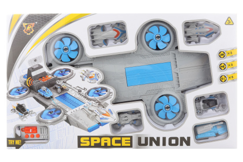 Vesmírná loď s doplňky na baterie. Balení obsahuje velkou plastovou vesmírnou loď, která vydává zvuky a vesmírná auta (4 ks). Napájení na 3 AG13 baterie (jsou součástí). Rozměry balení cca 45,5 x 27,5 x 8,5 cm. Věk 3+