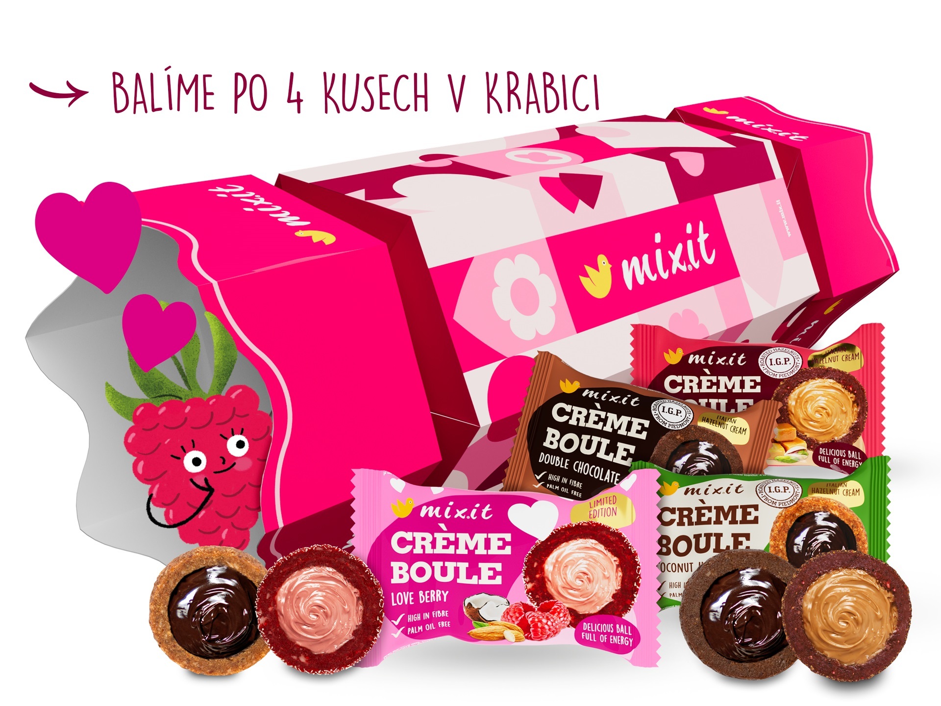 Život je jako bonboniéra. Nejlépe si ho vychutnáte ve dvou. :-) Je libo valentýnský bonbonek plný sametově jemných Crème boulí? V balíčku najdete příchutě Strawberry caramel, Double chocolate, Coconut heaven a malinovo-mandlovou limitku Berry Love. Samozřejmě vždy po dvou, abyste si mohli dopřát valentýnskou degustaci. :-) Hlavní role v této slaďárně hrají datle a sametový oříškový krém.- 8 krémových koulí v dárkovém balení ve tvaru bonbónu- energie na cokoliv, co chcete podniknout na Valentýna- 0 % umělých barviv a aromat, 100 % romantiky