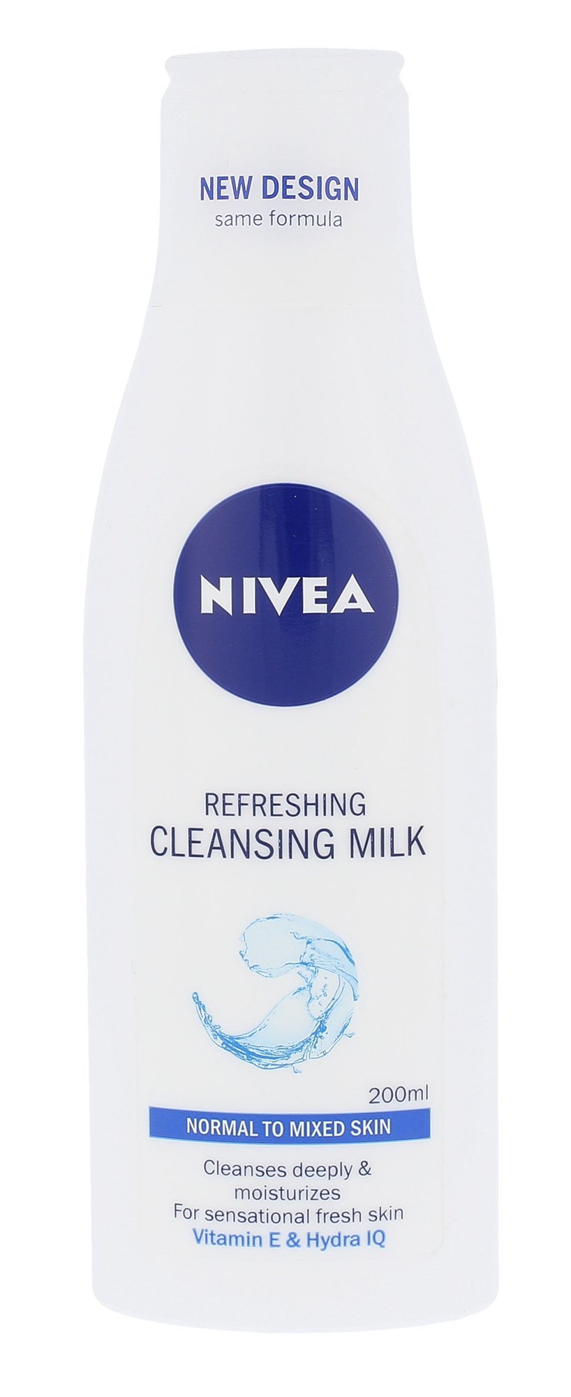 Osvěžující pleťové mléko **Nivea Refreshing Cleansing Milk**. Hloubkově čistí, odstraňuje make-up i voděodolnou řasenku. Hydratuje pleť a udržuje její přirozenou hydrataci v rovnováze. Osvěžující složení revitalizuje pleť. Obohacené o vitamín E a aktivní látku Hydra IQ. Použití: Aplikujte konečky prstů nebo vatovým tamponem na obličej, krk a dekolt. Zbytky pleťového mléka odstraňte tamponem, pleťovou nebo čistou vodou. Díky jemnému složení může být použito i na citlivou oblast kolem očí.