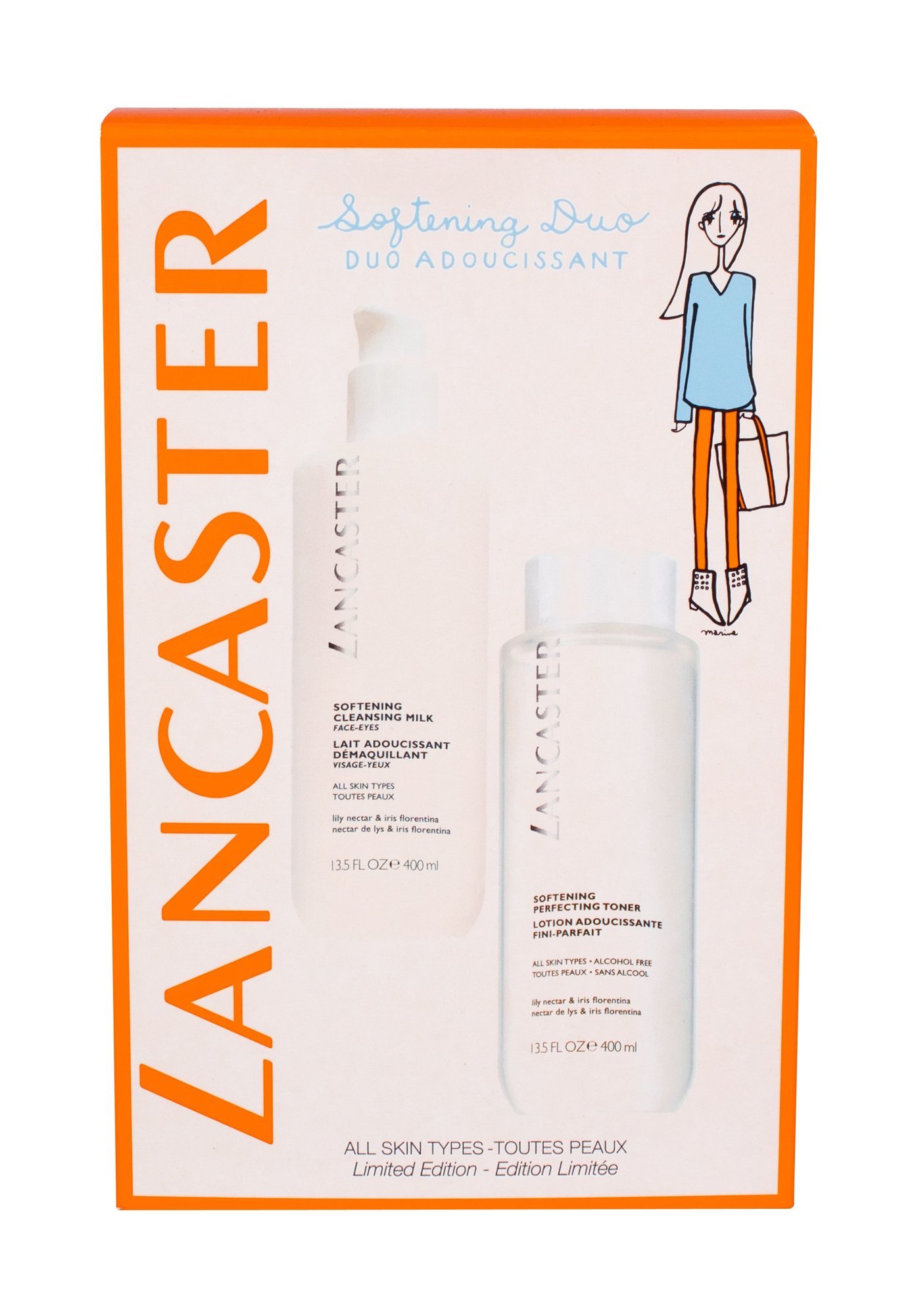 **Dárková sada na čištění pleti Lancaster.** **Složení kazety:** čisticí pleťové mléko **Softening Cleansing Milk 400 ml** Pleťové mléko šetrným způsobem odstraňuje z pleti nečistoty a make-up. Nevysušuje a pleť zůstane hebká a svěží. S čisticím pleťovým mlékem Softening Cleansing Milk zůstane Vaše pleť jemná a pružná. **Použití:** Aplikujte přípravek na vatový tamponek a otřete s ním pleť. Nemusíte oplachovat. čisticí pleťové tonikum **Softening Perfecting Toner 400 ml** Pleťové tonikum bez alkoholu nevysušuje a nedráždí pleť. Odstraňuje z pleti zbytky make-upu a nečistoty. Rozjasňuje pleť, díky výtažkům z bílých květin, lilií a kosatce. S pleťovým tonikem bude Vaše pleť jemná, rozjasněná a bude připravená na nanesení séra nebo krému. **Použití: **Aplikujte na vatový tamponek a jemnou masáží aplikujte na pleť. Neoplachujte.