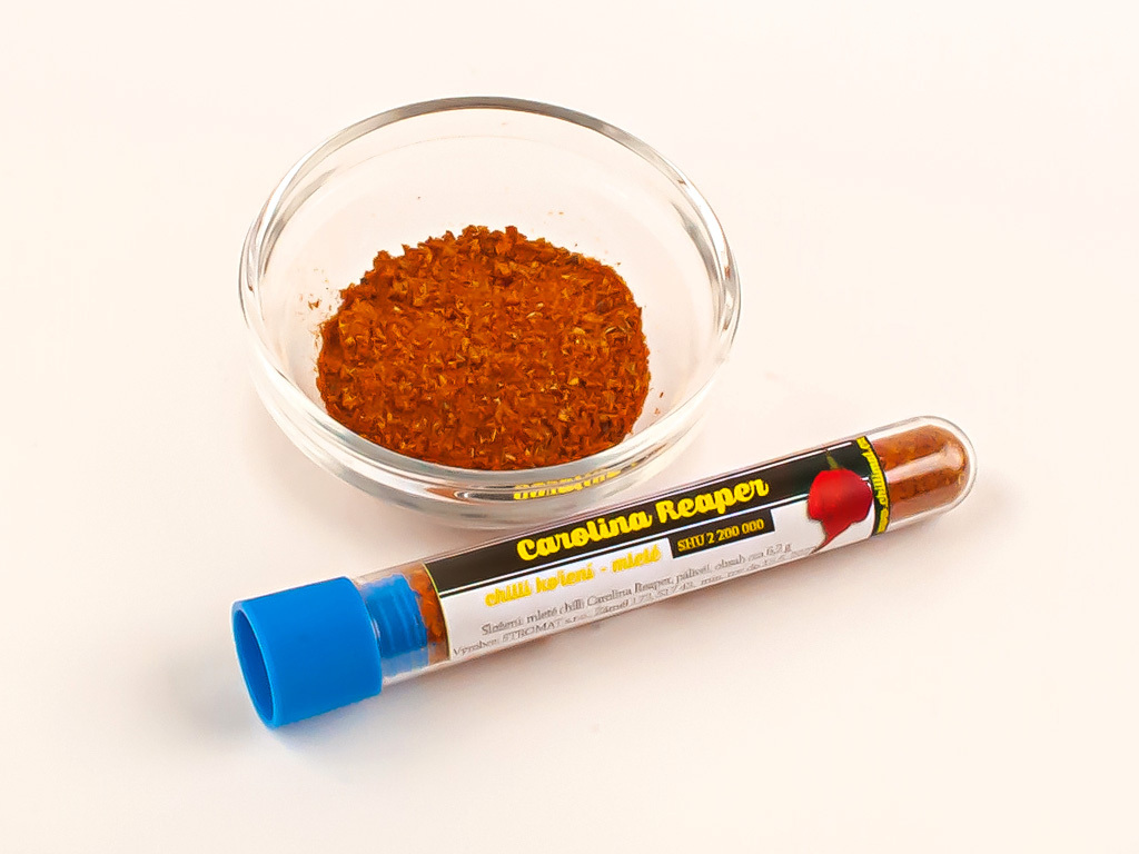 - Mleté chilli koření získané z Carolina Reaper papriček