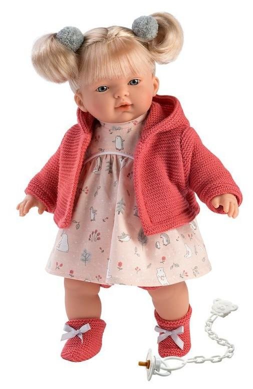 Mluvící panenka s měkkým látkovým tělem a s vlásky po celé hlavě. Po vytažení dudlíku z úst začne panenka říkat „mama“, „papa“ a vydávat reálný zvuk plačícího miminka. Panenku lze utišit dudlíkem. Velikost 33 cm. Součástí balení je 3 x knoflíková baterie LR44. číst celé