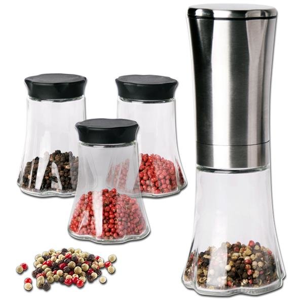 Nerezový gravitační mlýnek na koření se čtyřmi skleněnými kořenkami na různé druhy koření. Jednoduché ovládání - stačí jen otočit a mlýnek mele. Keramické vnitřní tělo mlýnku. Nastavitelná hrubost mletí. Objem kořenek 200ml. Každá kořenka má své víčko. Pohon mlýnku na 4 AAA baterie (nejsou součástí balení). Výška mlýnku 20 cm.