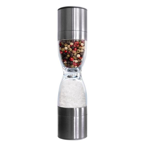 Ruční mlýnek na sůl/pepř ve tvaru přesýpacích hodin. Sůl a pepř se mele zvlášť na protilehlých stranách. Obě strany mají krytky proti sypání namletého obsahu. Materiál - nerez. Rozměry - 5,2 x 22 cm.