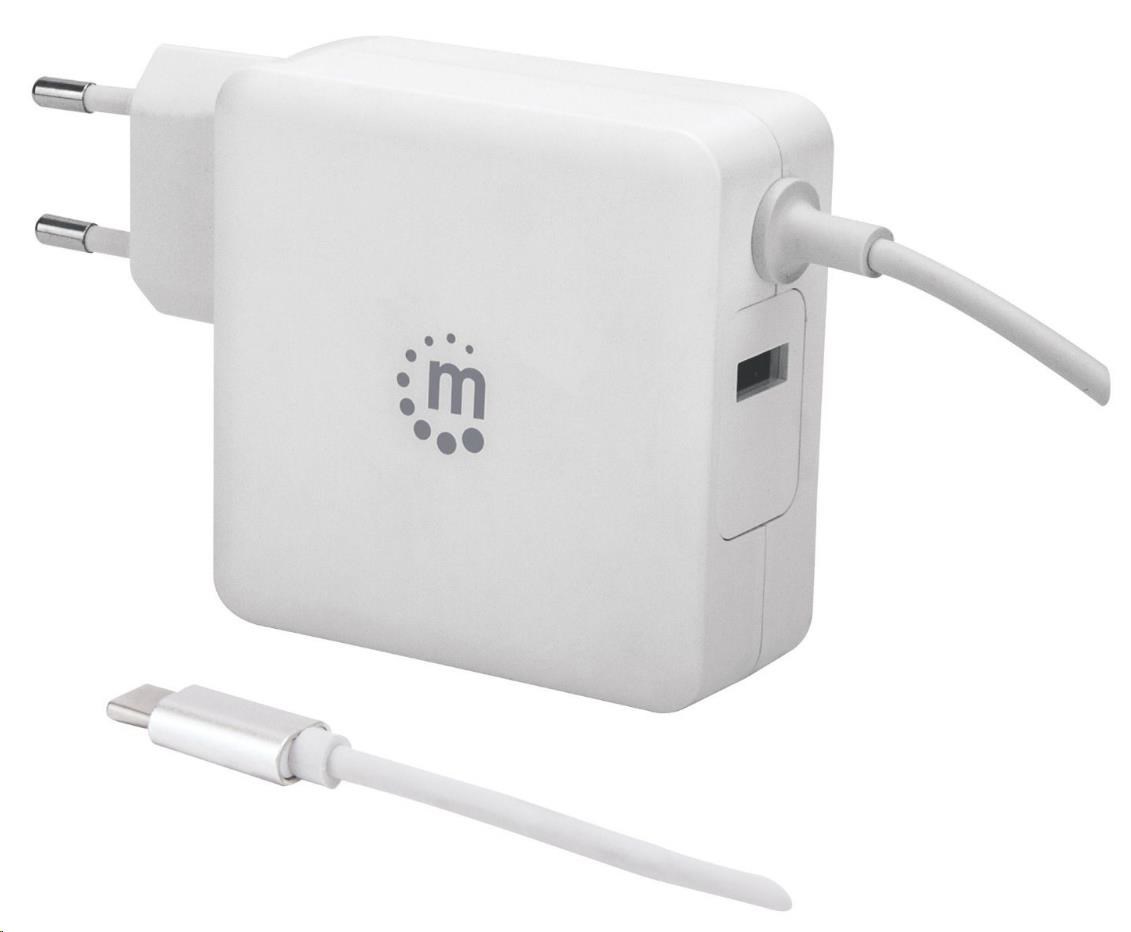 Enjoy complete charging power with the Manhattan Power Delivery Wall Charger with Built-in USB-C Cable - 60 W. The charger\'s attached USB-C cable uses Power Delivery (PD) technology to provide plenty of power to laptops and mobile phones, and the additional USB-A port can quickly charge any handheld device or tablet. The perfect companion for travelers with its stylish, compact and ultra-modern design, the Manhattan Power Delivery Wall Charger with Built-in USB-C Cable - 60 W also intelligently safeguards itself and your devices with its short-circuit-, overvoltage-, overcurrent- and overtemperature-protection functions.