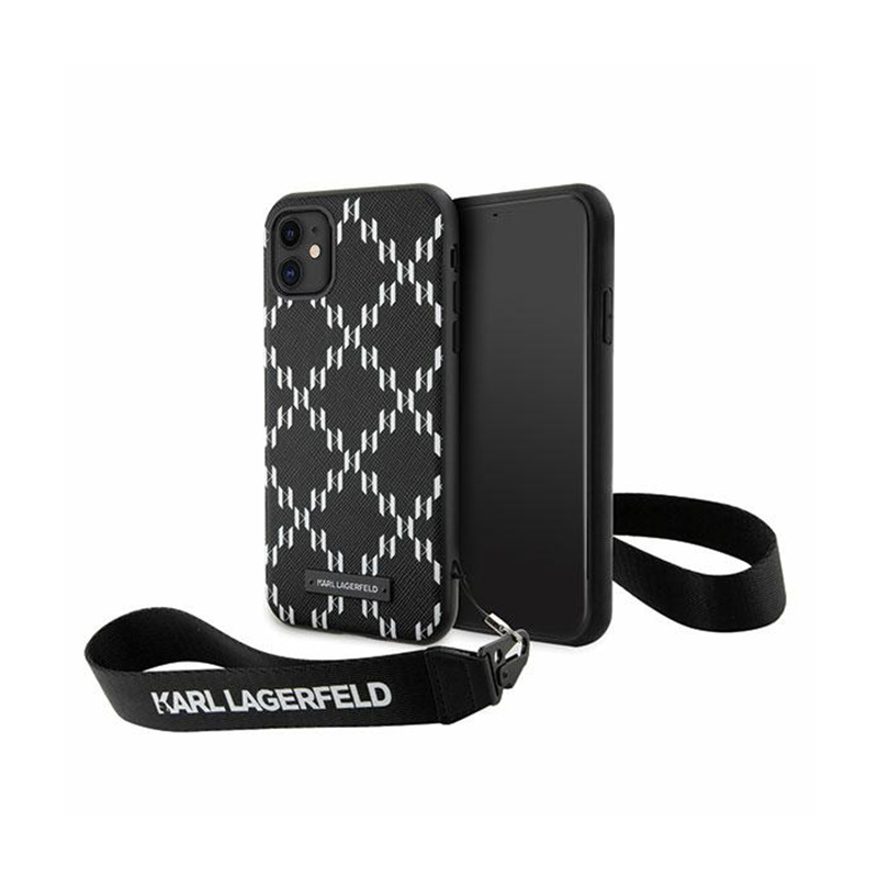 Karl Lagerfeld Monogram Losange Saffiano - pouzdro se šňůrkou na krk pro iPhone 11 (černé)