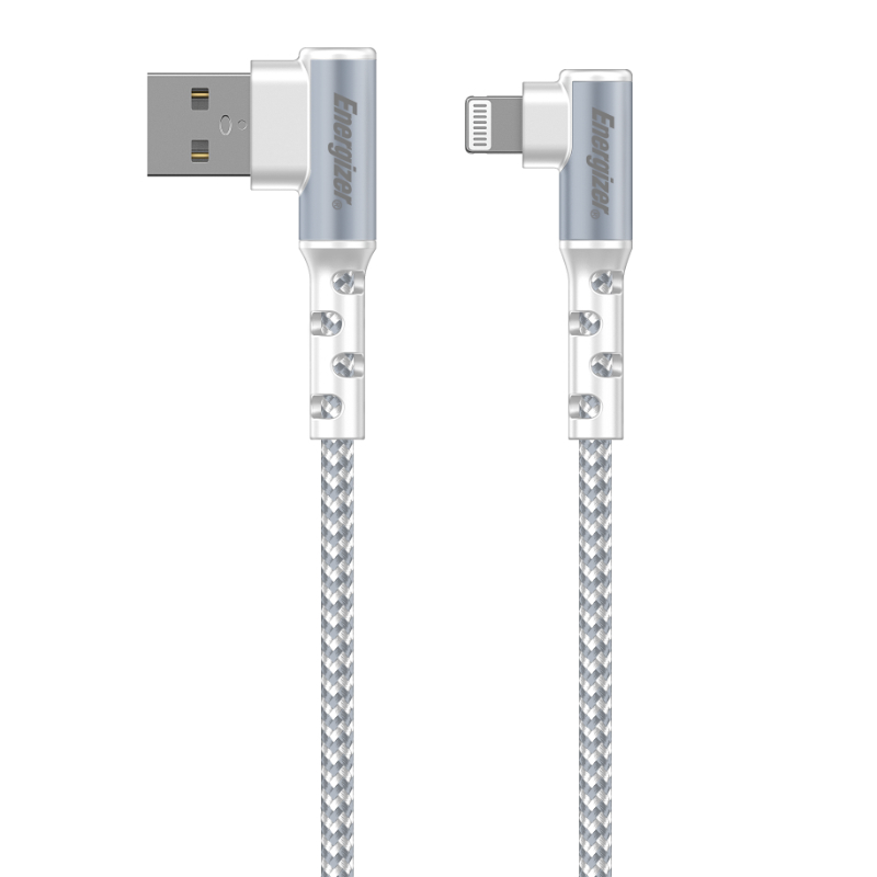 200 cm dlouhý nabíjecí a datový kabel Energizer s konektorem USB-A na Lightning 90° a certifikací Apple MFi. Kabel má tvar písmene L pro snadné zapojování a odpojování.