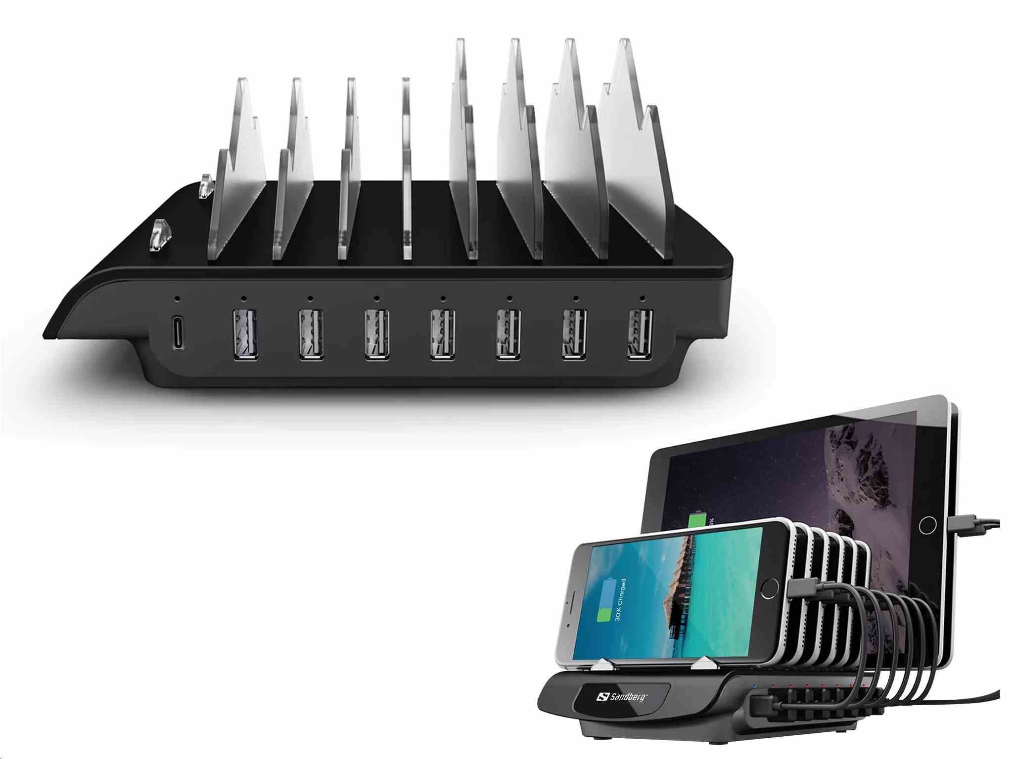 Sandberg Multi USB Charging Station je pro všechna mobilní zařízení doma i v kanceláři - vše lze nabít z centrální jednotky. S celkem sedmi USB-A porty a jedním USB-C portem můžete současně nabít až 8 zařízení. Jednoduše je pěkně uložte do nabíjecí stanice mezi praktické přepážky. Nabíjecí kabely nejsou součástí.