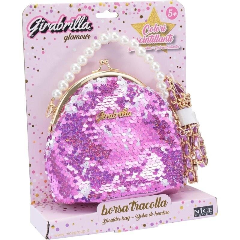 Cekinowa torebeczka połączona delikatnym obszyciem materiałowym, wykończona zdobieniami przy zapięciach, rączka z koralików, długi zdobiony przeplatany łańcuszek na ramię.
