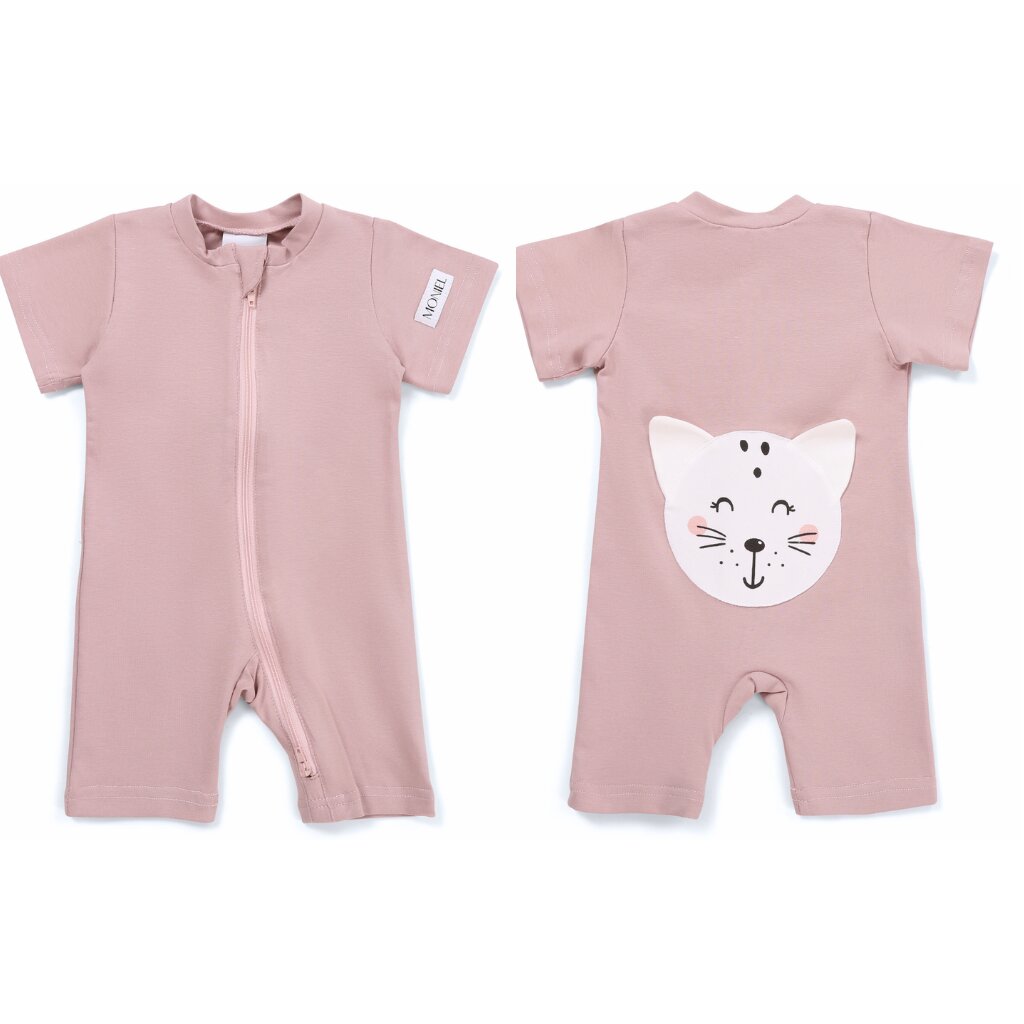 Dětský letní overal na zip s krátkým rukávem Moniel Kočka Pastel růžová je ideální jarní a letní oblečení pro děti. Nosit se dá jako dětské lehké pyžamo, domácí oblečení, ale i pohodlné letní oblečení na ven. Je ušitý z přírodní bavlněné látky hebké na dotek a odolné proti častému praní. Overal je ušitý v ČR. Velikosti od narození až do 4 let.