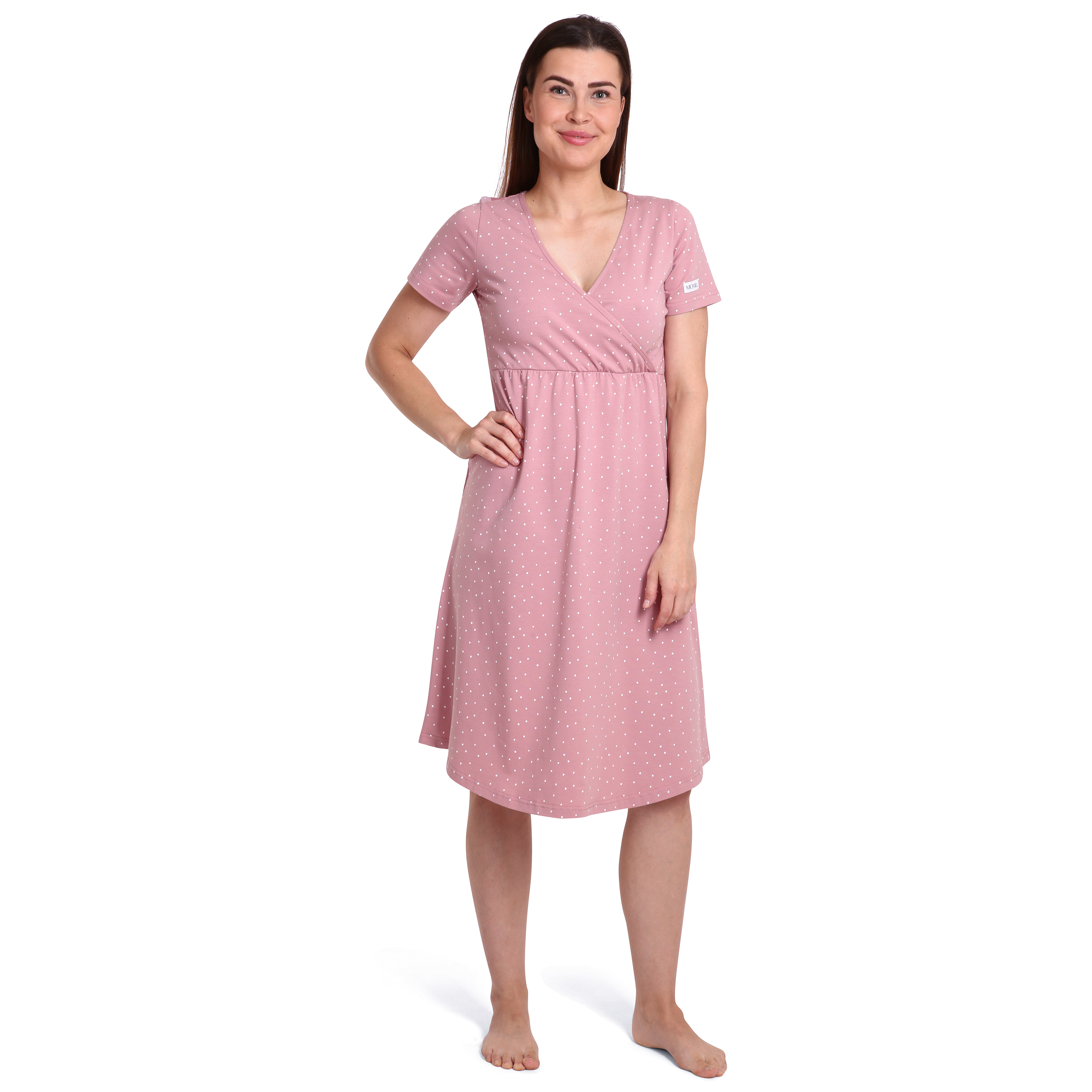 Dámská košilka a domácí šaty Moniel Dots růžová je těhotenská, kojící a mateřská zároveň. Je elastická a velmi pohodlná. Dokonale padne každé postavě. Má praktický střih pro pohodlné kojení a nošení ve dne i v noci. Ručně šitá v ČR.