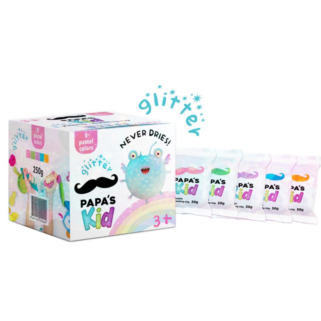 Papa\'s Clay - sada modelovací hmota v 5 třpytivých barvách - 250 gramů. Neomezená zábava a kreativita! Kvalitní, bezpečná modelína, která je ideální pro rozvoj jemné motoriky a fantazie vašich dětí. Kvalitní modelovací hmota podporuje učení skrze hru a umožňuje dětem vytvářet barevné výtvory, které zůstanou živé a nezasychají. Perfektní pro domácí i školní tvoření.