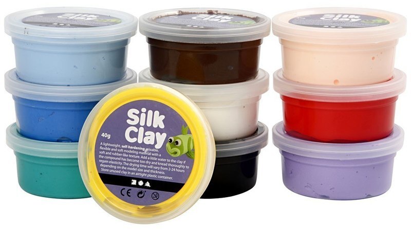 Silk Clay to samotwardniejąca masa modelarska na bazie wody. Można stosować na różnych powierzchniach (drewno, papier, nieszkliwiona ceramika, materiał itp.). Można łączyć kolory lub malować akrylowymi farbami po wyschnięciu. Przed użyciem należy wymieszać! Przechowywać w zamkniętym plastikowym pojemniku. Wymiary opakowania: wysokość 19cm, szerokość 17,2 cm, głębokość 8,8 cm. Zawiera 10 opakowań po 40 gram masy, różne kolory.