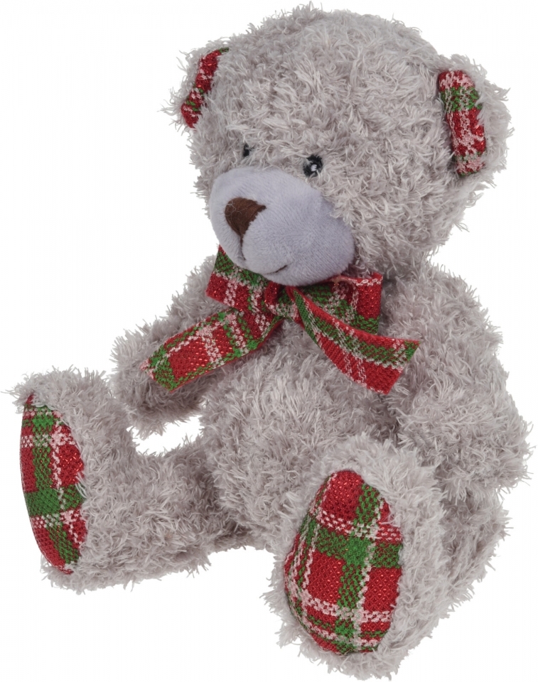Roztomilý plyšový medvídek s károvanou látkou na ouškách, ťapkách a s károvanou mašličkou.