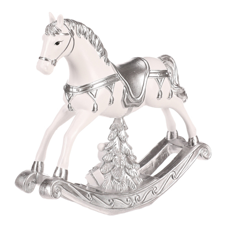 Vyzdobte si o vánočních svátcích poličku, stůl, nebo jiný vhodný prostor, touto elegantní soškou v podobě houpacího koníka z polyresinu. Nádherná kombinace bílého koně a stříbrných ozdobných prvků, včetně osedlání, a celého spodku, dodává této dekoraci na vznešenosti. Spodní část je navíc doplněná schovaným stromečkem a dárky, které jako by čekaly na to, až je někdo rozbalí.