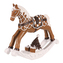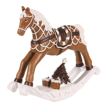 Vyzdobte si o vánočních svátcích poličku, stůl, nebo jiný vhodný prostor, touto úžasnou soškou v podobě houpacího koníka z polyresinu. Vypadá, jako by však byl vytvořen z perníku, či marcipánu a vyzdoben sladkou polevou. Koník samotný je v hnědé barvě, má barevné osedlání, přičemž spodní část je celá v bílém a doplněna hnědými dárečky a vánočním stromkem.