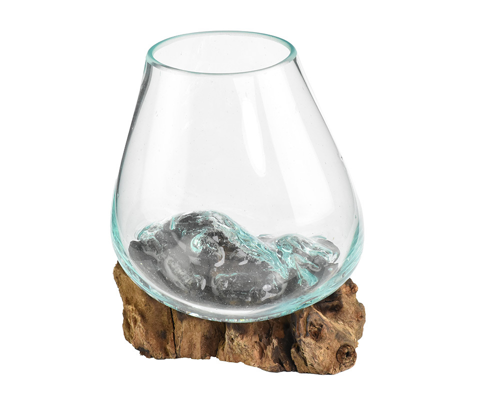 Tato skleněná nádoba spojuje tavené sklo a přírodní dřevo v praktický a estetický doplněk do interiéru. Sklo je ručně tvarované tak, aby přesně zapadlo na dřevěný podklad, což vytváří příjemný kontrast mezi chladným sklem a teplým dřevem. Každý kus je originální díky přirozené struktuře dřeva a jedinečnému tvaru skla.Nádoba dodá prostoru jednoduchý a přírodní prvek, který se hodí do moderních i klasických interiérů.Parametry:Průměr hrdla: 5 - 6 cmŠířka nádoby: 10 - 12 cmVýška: 13 - 15 cm