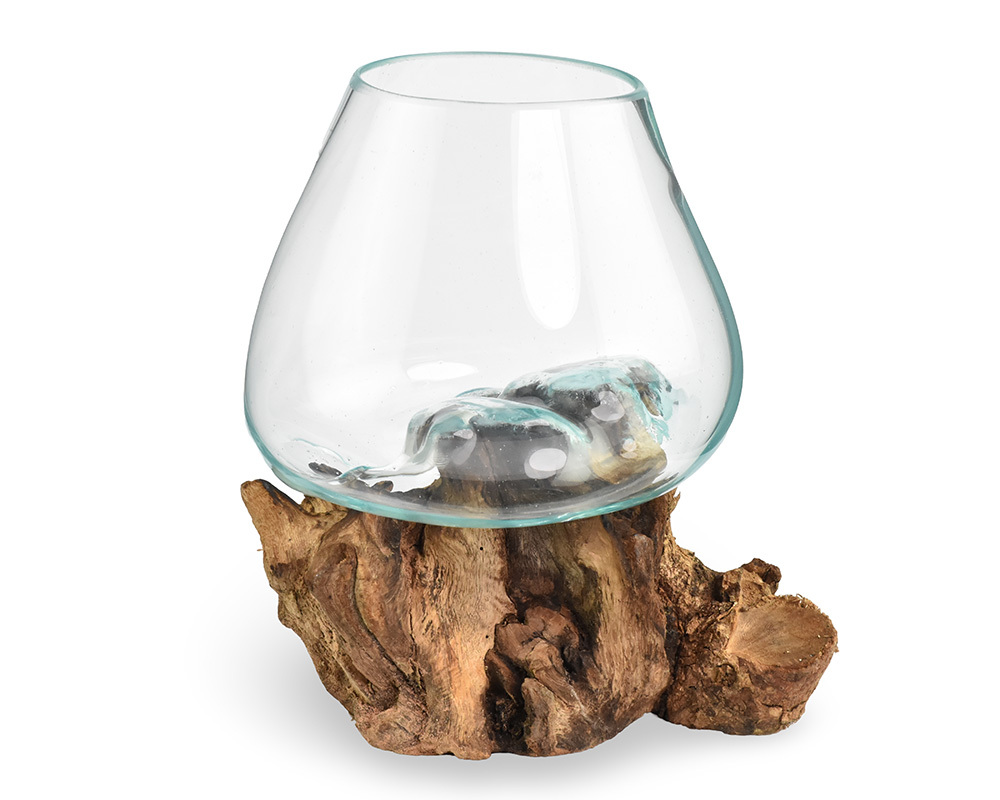 Tato nádoba vznikla spojením ručně tvarovaného taveného skla a přírodního dřeva. Každý kus je originál díky přirozené struktuře dřeva a jedinečnému tvaru skla, které dokonale zapadá na dřevěnou podložku. Kombinace chladivého skla a teplého dřeva dodává produktu harmonii a přirozený kontrast, který se hodí jak do moderních, tak i klasických interiérů.