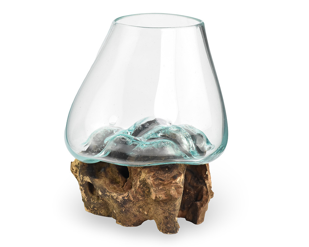 Tato skleněná nádoba spojuje tavené sklo a přírodní dřevo v praktický a estetický doplněk do interiéru. Sklo je ručně tvarované tak, aby přesně zapadlo na dřevěný podklad, což vytváří příjemný kontrast mezi chladným sklem a teplým dřevem. Každý kus je originální díky přirozené struktuře dřeva a jedinečnému tvaru skla.Nádoba dodá prostoru jednoduchý a přírodní prvek, který se hodí do moderních i klasických interiérů.