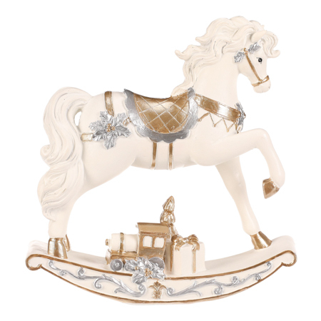 Houpací koník v tomto malebném, až slavnostním provedení přináší kouzlo sváteční atmosféry s puncem starých časů. Precizně zdobená světle krémová figurka z polyresinu s jemnými zlatými i stříbrnými detaily a dárkem na podstavci působí svátečně a velmi elegantně. Jedná se tak o skvělý doplněk...