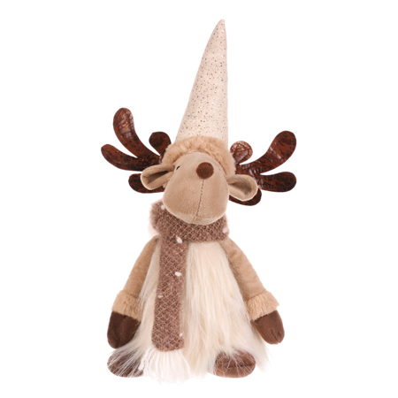 Látkový sob v béžovo-hnědém teplém oblečení vnese do vašeho domova veselou a hřejivou atmosféru. Jeho roztomilý obličej, špičatá čepice s bambulí a celkově veselý vzhled zútulní každý interiér. Tato látková figurka, hebká na dotek, se skvěle hodí jako dekorace na poličku, stůl nebo ji můžete umístit i na pohovku nebo gauč, kde bude vaším hravým společníkem.