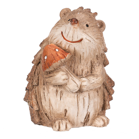 Zahradní figurka v podobě ježka svým provedením krásně zapadne mezi keře a další dřeviny, čímž vytvoříte pohádkové lesní zátiší. Ježek v béžovo-hnědých odstínech, držící červenou mochomůrku, je vyroben z polyresinu, ale vypadá jako by byl právě ze dřeva. Jeho bodliny jsou tvořeny jakoby drobnými nasekanými částmi větviček a zbytek těla má charakteristickou dřevěnou texturu.
