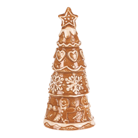 Keramický perníkový stromek s hvězdou na špici vypadá jako opravdová vánoční lahůdka. Hnědý povrch s bílou polevou zdobí roztomilá srdíčka, sněhové vločky a panáčci, což mu dodává pohádkový vzhled. Skvělá dekorace, která přinese kouzlo Vánoc do každého prostoru. číst celé