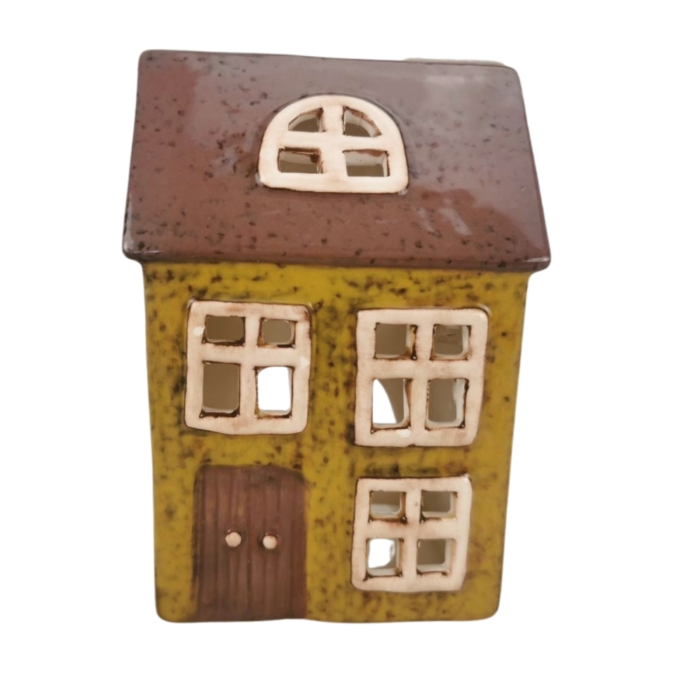Keramický domeček na svíčku, žlutohnědý, 14 cm