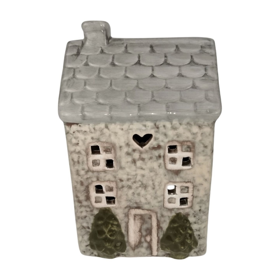 Šedý keramický domeček na čajovou svíčkuKrásná dekorace, kterou lze využít k celoročnímu použití.Propracované detaily a sytá barva.výška: 15,7 cmšíře: 8,1 cmhloubka: 9,5 cmmateriál: keramikabarva: šedá