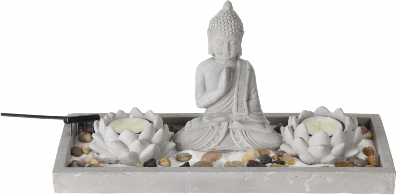 Zenová zahrada s Buddhou, leknínovými svícínky, kamínky, pískem a hrabičkama. Zenová zahrada slouží k meditaci a rozjímání. Tato malá zahrádka poslouží k meditaci i u vás doma.