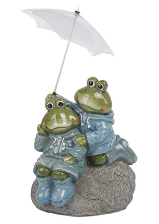 Tato detailně zpracovaná soška zachycuje dvě žábky v deštivém počasí, oděné do pláštěnek, které sedí na kameni. Je to neobvyklá dekorace, která vnese radost a pozitivní atmosféru do jakéhokoliv prostoru. Díky svému univerzálnímu tématu je vhodná jak do bytu, tak na terasu či zahradu.
