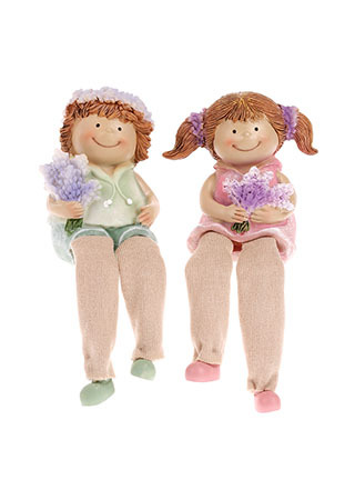Levandulová dívka nebo chlapec sedící, nohy z textilu, polyresin, cena za 1ks.