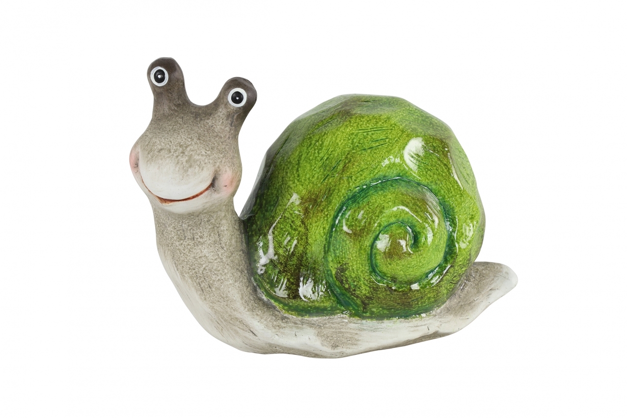 Keramický šnek se zelenou ulitou a roztomilým úsměvem. Dekorace vynikne venku na zahradě, ale i v interiéru.