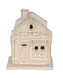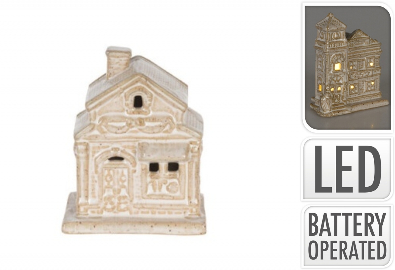 Porcelánový domeček s LED diodou teplé žluté barvy. Napájení na 2x LR44 baterie (baterie jsou součástí výrobku).