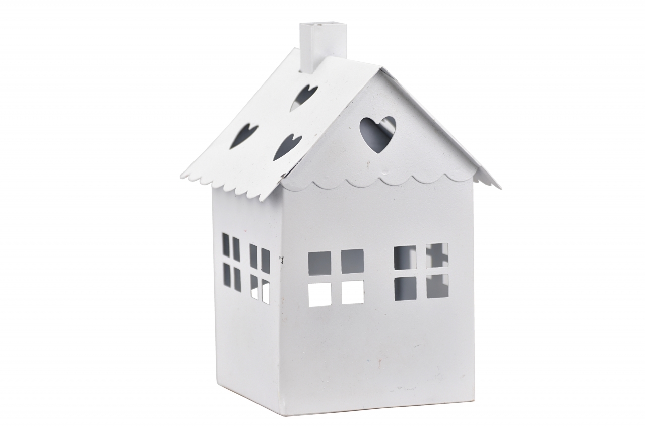 Kovový svícen domek v bílé barvě na LED nebo čajovou svíčku. Okénka domku zvýrazní zapálená svíčka.