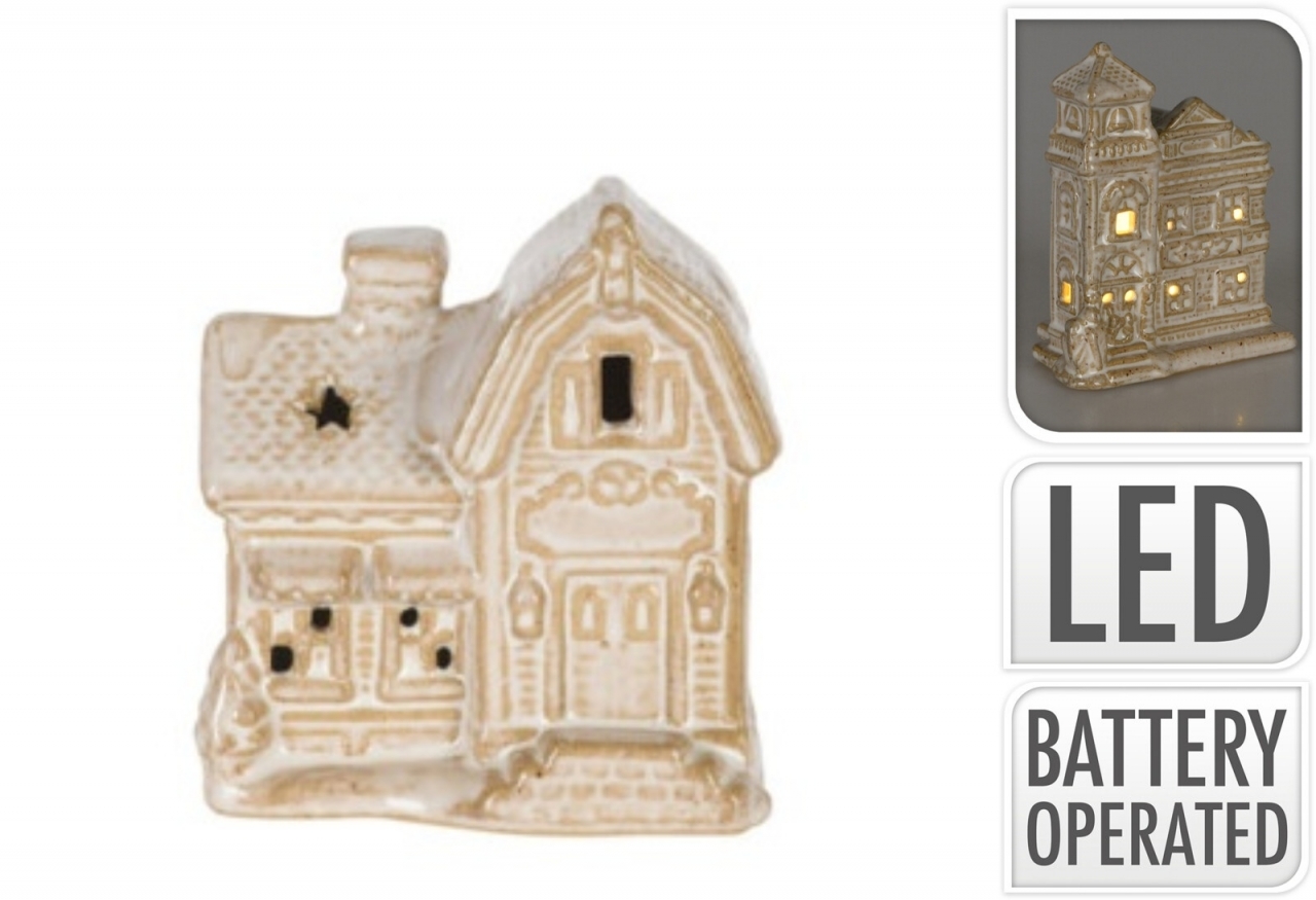 Porcelánový domeček s LED diodou teplé žluté barvy. Napájení na 2x LR44 baterie (baterie jsou součástí výrobku).